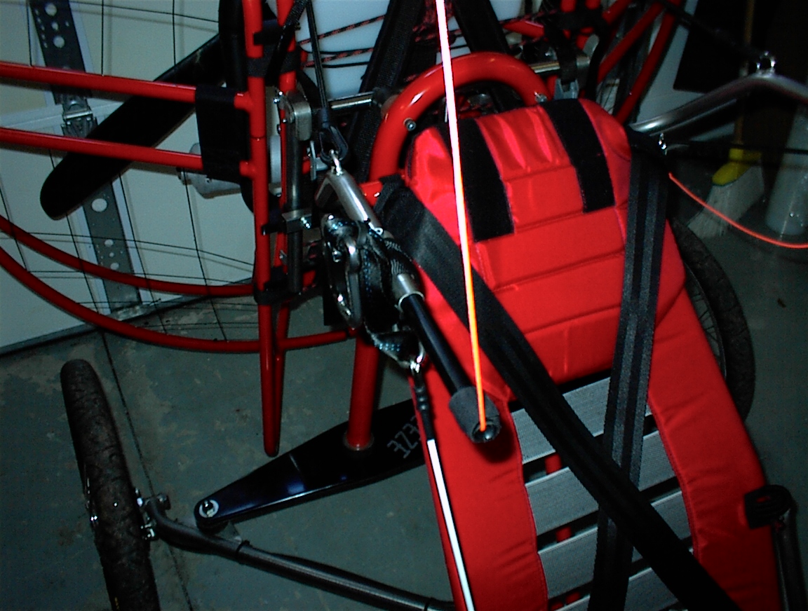 Unlike other PPG trikes, there is not a harness to strap into. The Flyke seat consists of a seat board and reclining seatback. The seat is heavily padded and very comfortable. A four-point seatbelt ensures the pilot stays in the seat while flying. Since the pedals for the bicycle are obviously offset (one high, one low), Fresh Breeze has also provided folding foot-pegs to rest your feet on when flying.