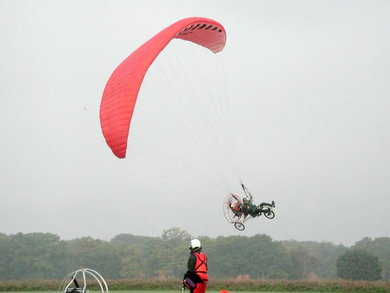 Given that the all-up weight of the Flyke, motor, and fuel will likely be 100lbs more than the pilot weight, a larger wing may be required. As with most PPG’s, a higher wing loading is recommended. I test flew the Flyke with a large Silex, although Chris tells me that the factory pilots in Germany are flying them with medium and even small Silexes!